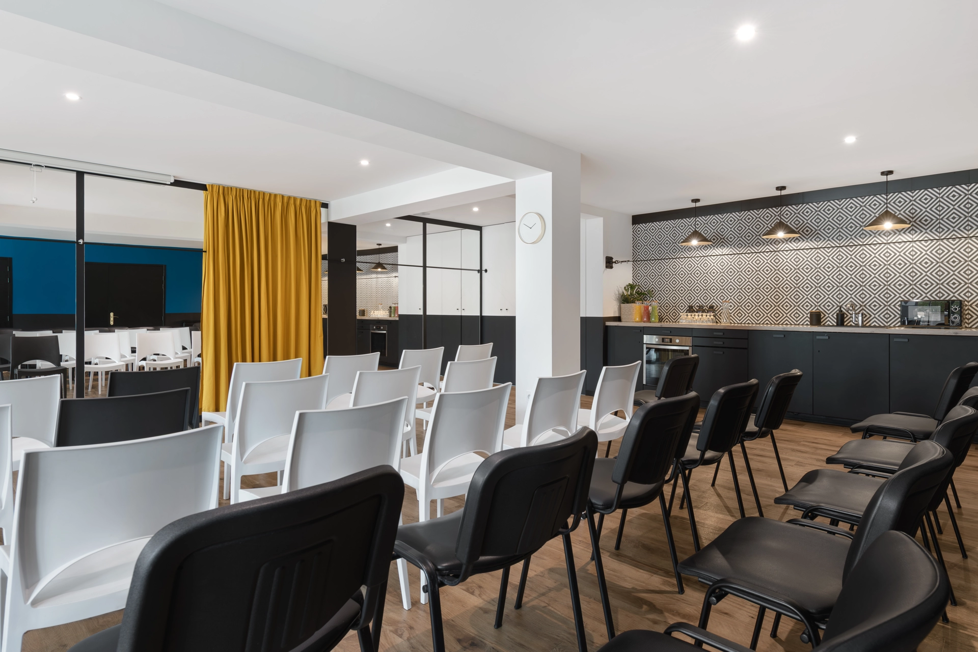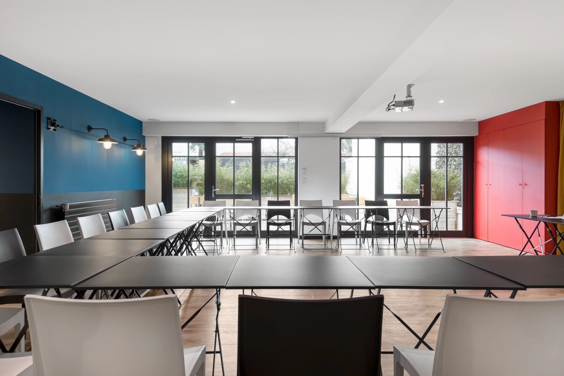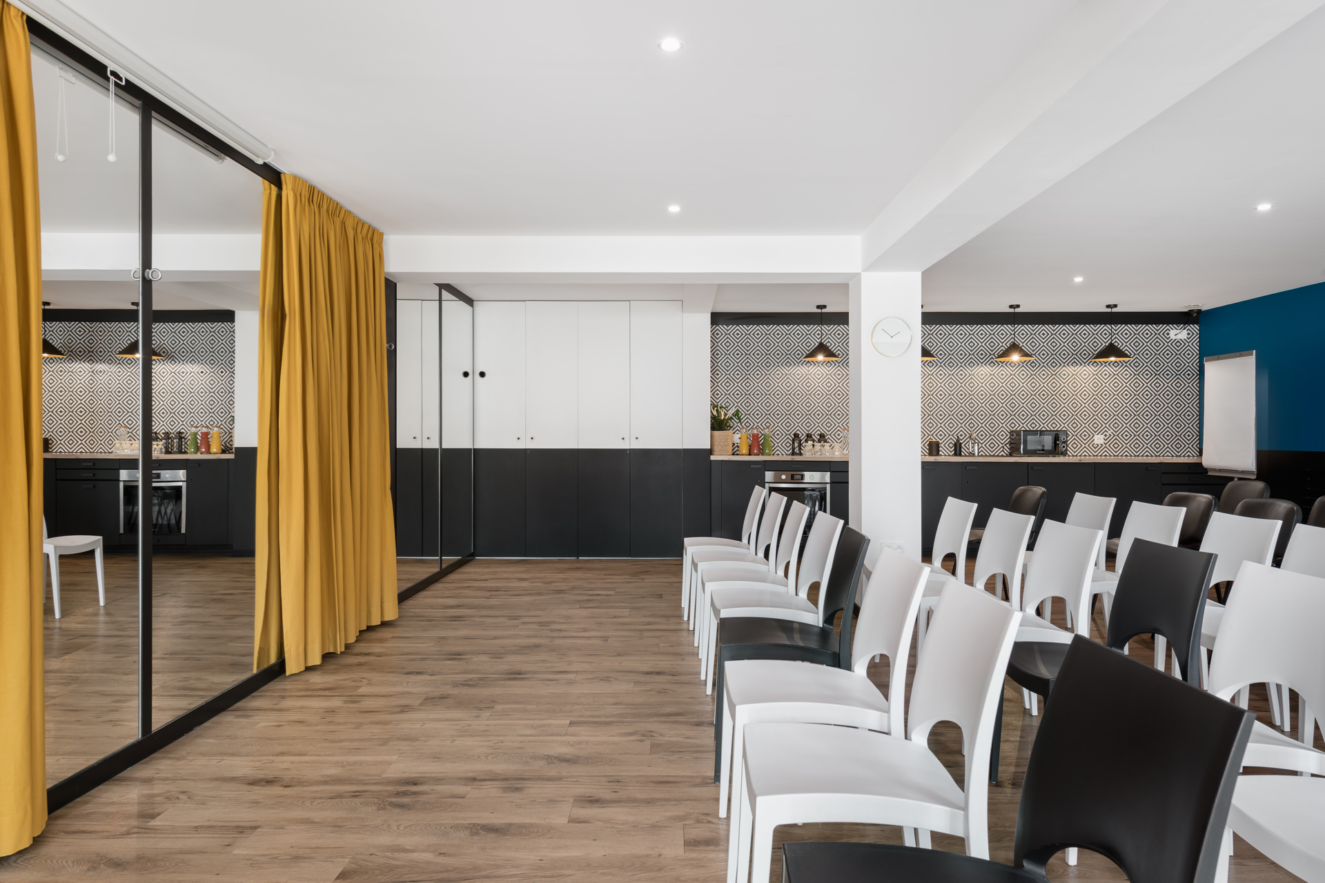 Cet espace de 74 m² vous permet d’accueillir jusqu’à 50 personnes en configuration cocktails et propose un accès direct à la terrasse. Ses grands miroirs et ses deux vastes baies vitrées permettent une luminosité maximale et un cadre agréable orienté vers l’extérieur. Vous pouvez aussi bénéficier du grand plan de travail avec cuisine privative équipée qui se situe au fond de la salle et qui permet d’organiser un espace de pause à proximité immédiate. L’espace est équipé d’un vidéoprojecteur avec écran et d’un système de sonorisation avec six enceintes intégrées. Cette salle est accessible aux personnes à mobilité réduite.