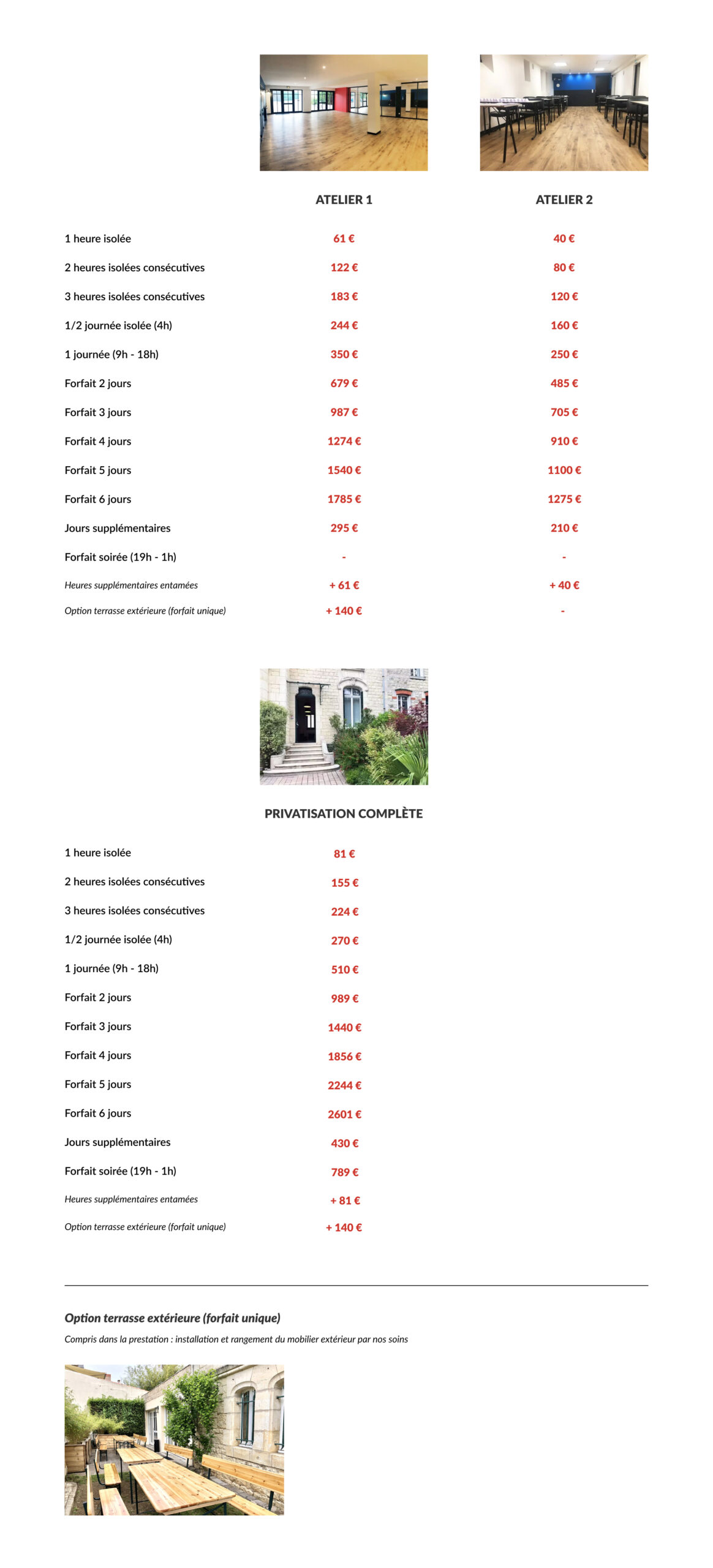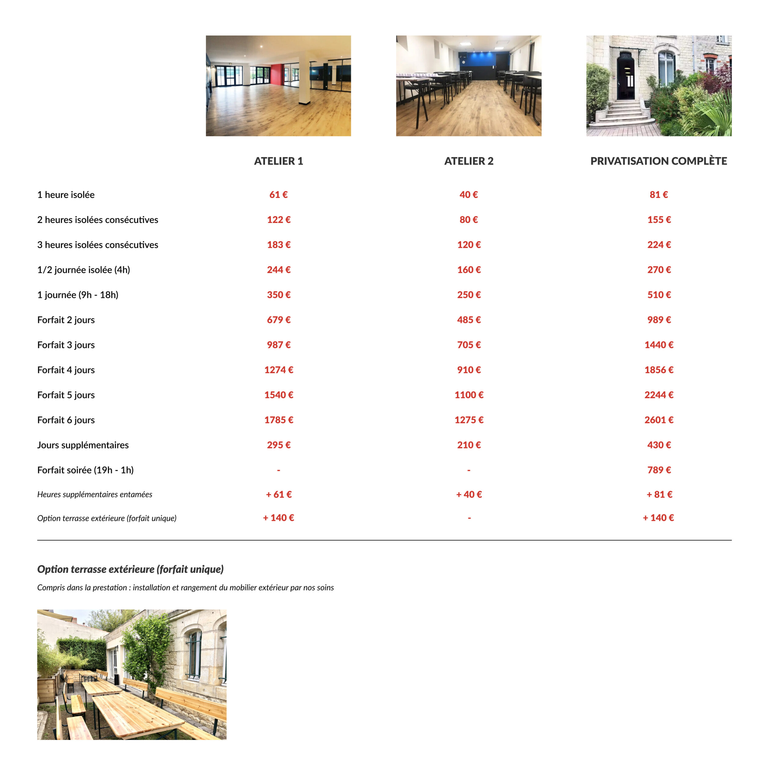 Nos tarifs sont donnés à titre indicatifs et sont susceptibles de varier en fonction de la période de l’année et des jours réservés (semaine ou week-end).